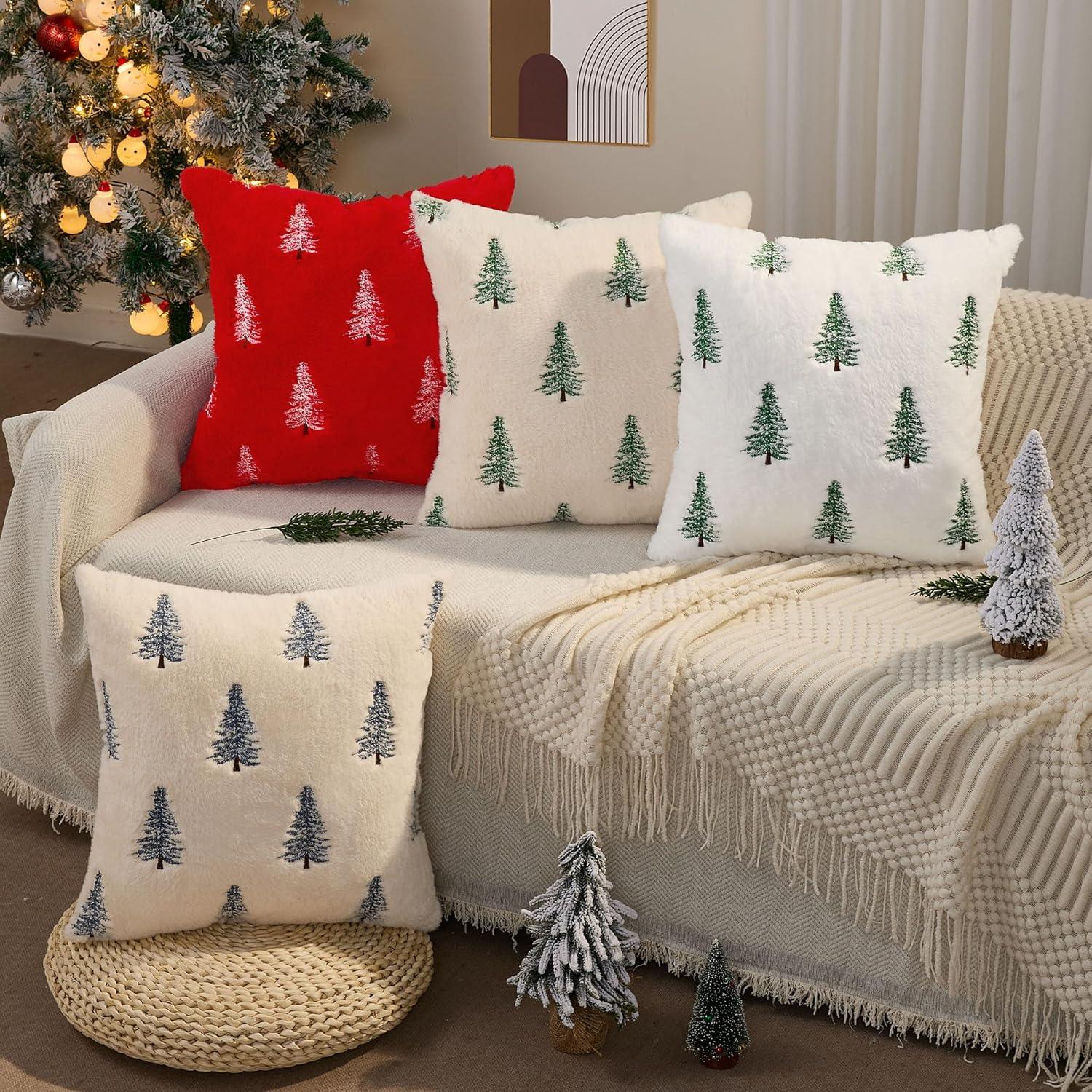 DFXSZ Christmas Pillow Covers 18x18 inch Set of 2 Green Embroidered Christmas Tree Decoration Beige Soft Plush Faux Fur Jacquard Throw Pillows for Bedroom Sofa Holiday Winter Home Decor PTK071C18(Red White)