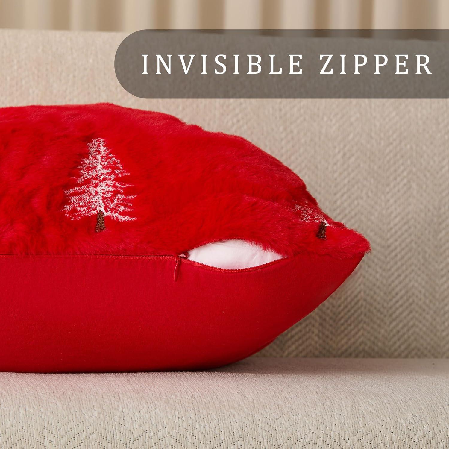 imageDFXSZ Christmas Pillow Covers 18x18 inch Set of 2 Green Embroidered Christmas Tree Decoration Beige Soft Plush Faux Fur Jacquard Throw Pillows for Bedroom Sofa Holiday Winter Home Decor PTK071C18Red White