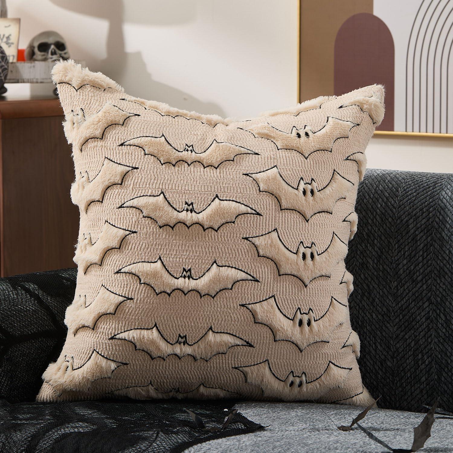DFXSZ Halloween Pillow Covers 18x18 inch Set of 2 Beige Bat with Black Eyes Throw Pillow Cases Soft Plush Faux Fur Wool Couch Cushion Case for Chair Sofa Bedroom Living Room Home Decor PTK059A18(Beige)