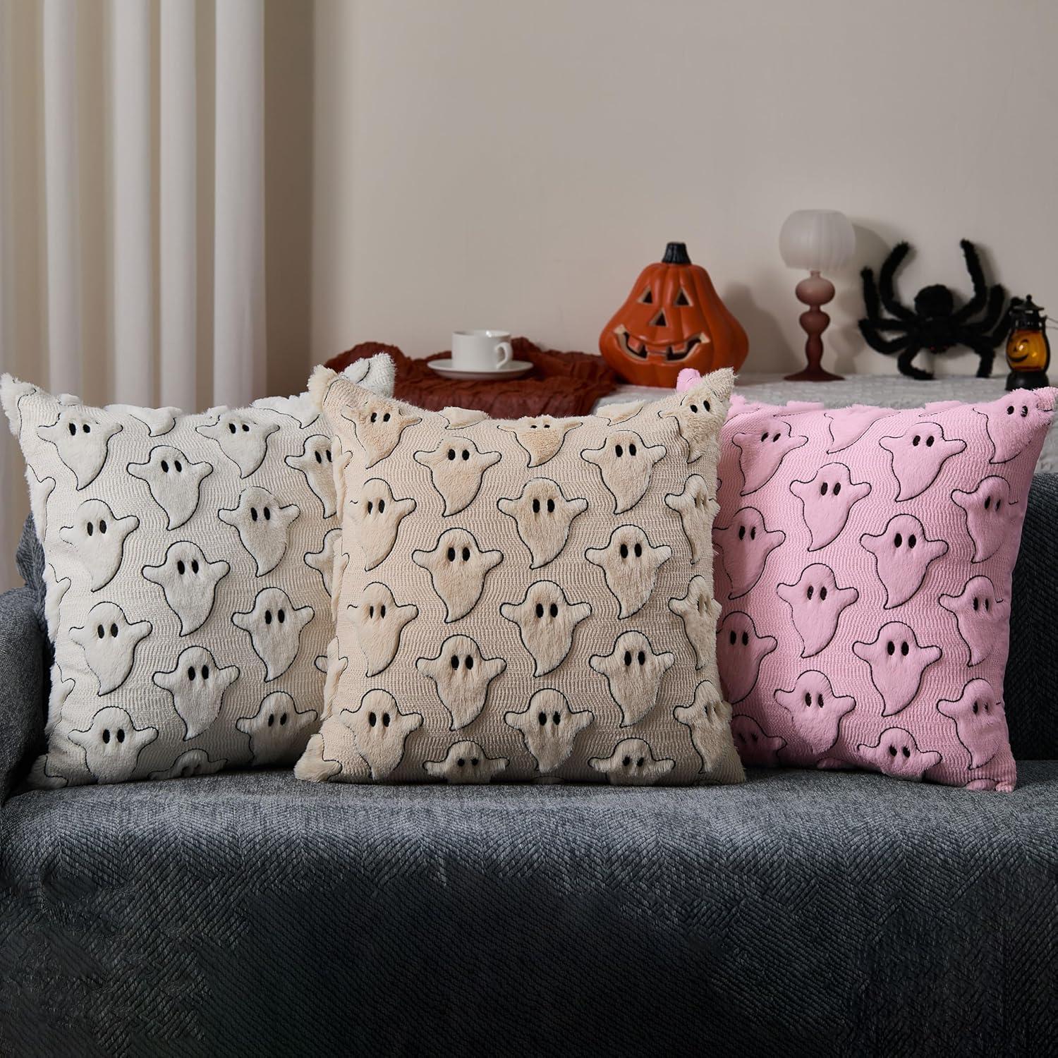 DFXSZ Halloween Pillow Covers 18×18 inch Set of 2 Black Eyes White Ghost Throw Pillow Cases Soft Plush Faux Fur Wool Couch Cushion Case for Chair Sofa Bedroom Living Room Home Decor PTK056A18(Pink)