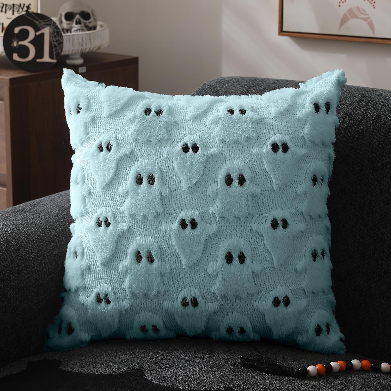 DFXSZ Halloween Pillow Covers 18×18 inch Set of 2 Black Ghost Throw Pillow Cases Soft Plush Faux Fur Wool Couch Cushion Case for Chair Sofa Bedroom Living Room Home Decor PTK03F18(Blue)