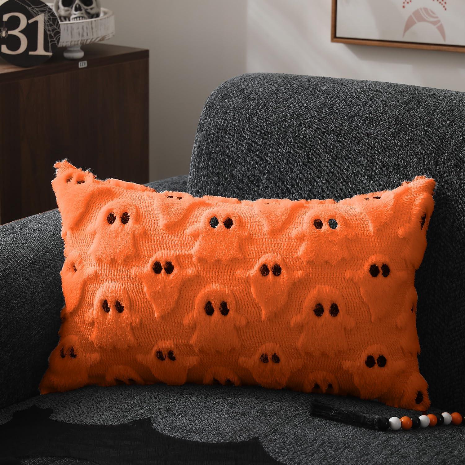 DFXSZ Halloween Pillow Covers 18x18 inch Set of 2 Black Ghost Throw Pillow Cases Soft Plush Faux Fur Wool Couch Cushion Case for Chair Sofa Bedroom Living Room Home Decor PTK03F18(Orange)