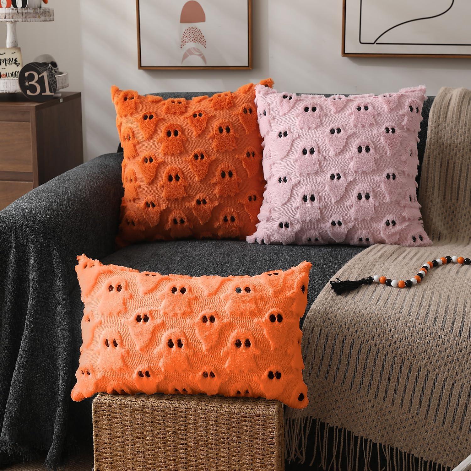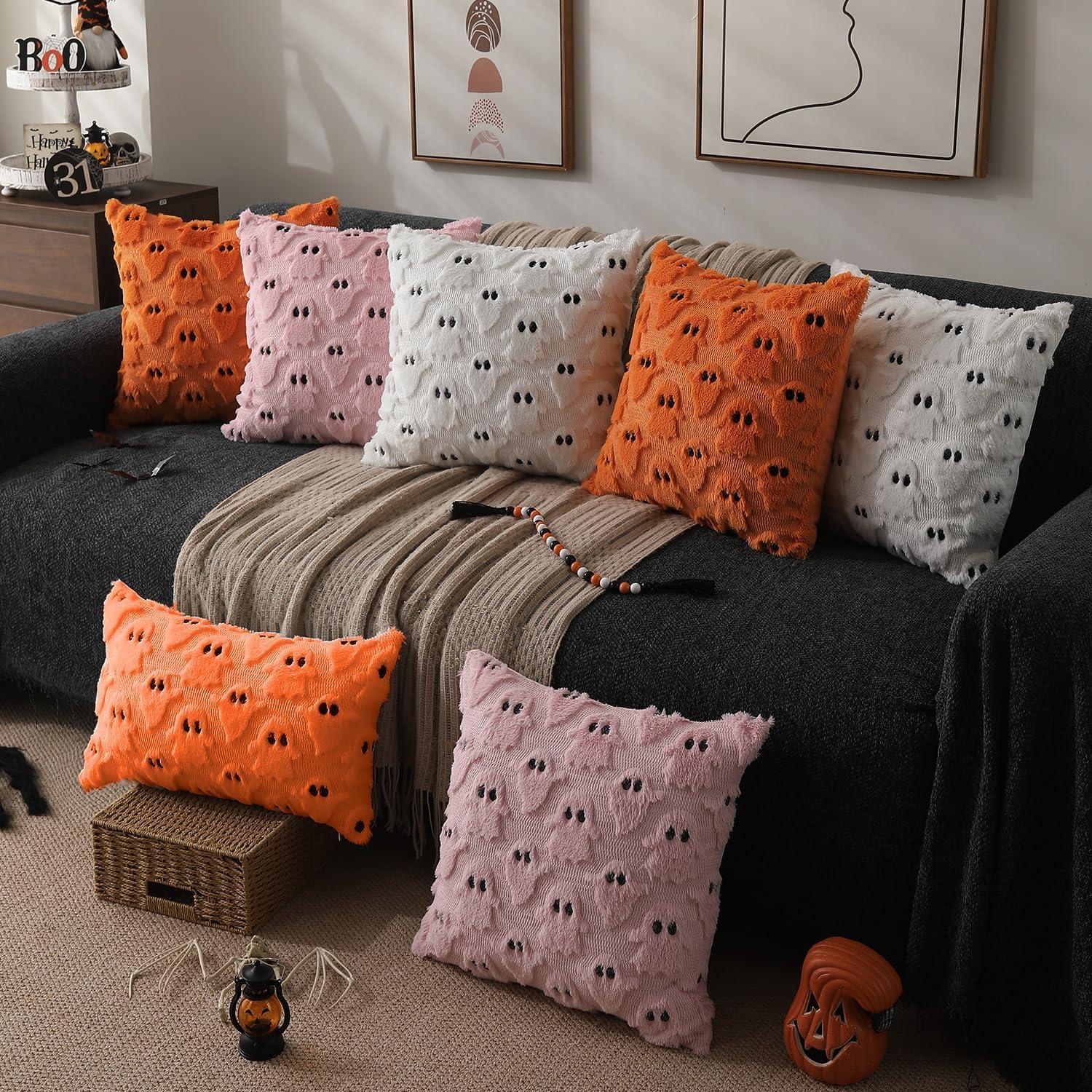 DFXSZ Halloween Pillow Covers 18×18 inch Set of 2 Black Ghost Throw Pillow Cases Soft Plush Faux Fur Wool Couch Cushion Case for Chair Sofa Bedroom Living Room Home Decor PTK03F18(Orange)